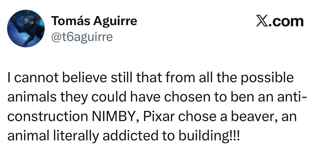 This seems like a straightforward tale of “nature good, building public infrastructure bad,” and so predictably many have characterized it as Pixar’s NIMBY film.